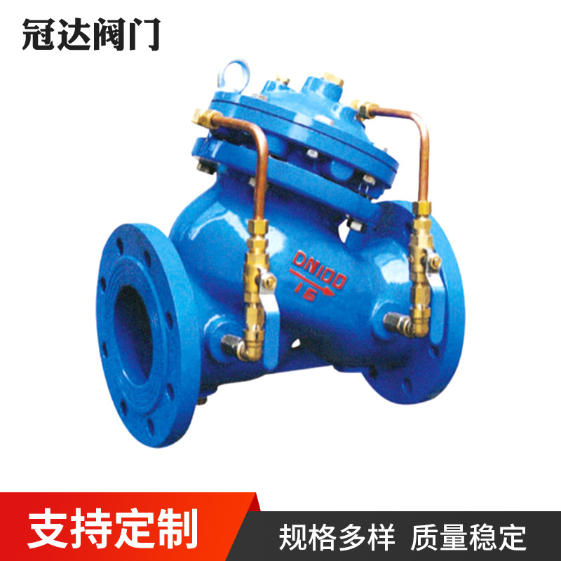 多功能水泵控制阀(JD745X) 一、产品简介 本厂生产的多功能水泵控制阀分隔膜型、活塞型两大类。依城镇建设行业标准:《多功能水泵控制阀》CJ/T167-2002设计制造。每类产品中都由一个主阀及导阀、配管、管件等组成。根据使用目的、功能及场所的不同,只需通过改变导阀及配件的安装管路,形成一个完整的控制系统,就可以得到性能要求不同的各种阀门。多功能水泵控制阀JD745X隔膜型是本企业产品之一(见简图)。该阀能够调控开启、关闭速度,在系统运行中能起到逆止、消水锤、保护水泵、电机、管路的作用。 二、用途 安装在市政、建筑、钢铁、冶金、石油、化工、煤气(天然气)、食品、医药、电站、核电等领域的取水、送水、潜水、污水泵房及石油、化工流体的输送系统中,融电动阀、止回阀和水锤消除器三种设备的功能于一体,能有效地提高系统安全可靠性,满足系统自动化控制要求。 三、工作原理及特点: 多功能水泵控制阀安装在系统管线上或水泵出口端,正常运行中,进口端介质推动阀盘上移,同时介质通过流量控制器进入中腔,使阀门迅速打开;停止运行时,出口端介质通过调节阀进入上腔,使驱动装置下移带动大、小盘向下运动,快速或缓慢关闭阀门,防止介质倒流。 其特点如下: 1、安全可靠性高。具有速闭、缓闭以及吸消除水锤措施,而且动作完全联锁,不会产生误动作。 2、无需操作控制。当水泵启停时,巧妙地利用阀门两端的介质及其压力差作为驱动介质和控制动力,使阀门自动按水泵操作规程的要求进行动作。 3、无需专业调试。阀门动作不受液位高差和出水压力以及水泵流量变化的影响,适应范围广。 4、基本无需维修,寿命长。 5、节能效果明显。利用进口端的压力进入膜片下腔支撑膜片压板及阀杆的重量,阻力损失小。